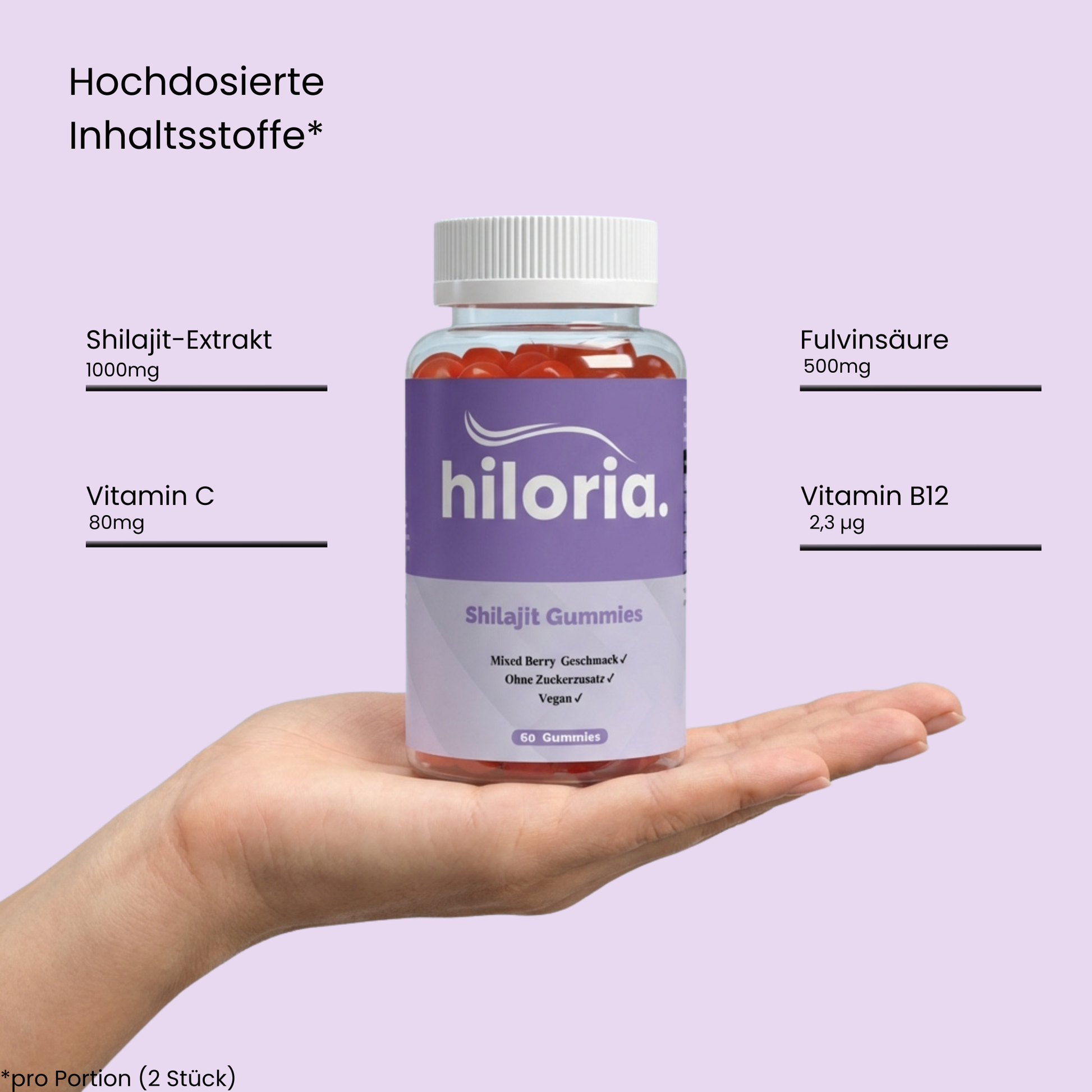 Unsere Shilajit Gummies liefern dir pro Tagesportion (2 Gummies / 6g) eine gezielte Kombination aus natürlichen Wirkstoffen: